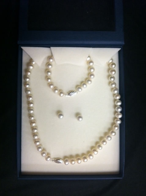 terSterSterling 8-9mm white cultured freshwater pearl round necklace, bracelet, and earrings set. The necklace and bracelet measure 5/16 inch in width with bead clasps. The earrings measure 5/16 inch in drop and width and have tension post backs