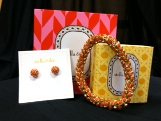 Stella Dot stretch bracelet in vintage gold plating with hand set coral acrylic stones and coral hued Czech glass stud earring will add style to any wardrobe.